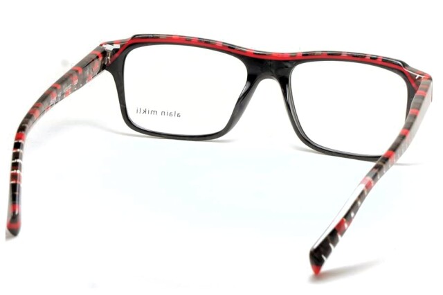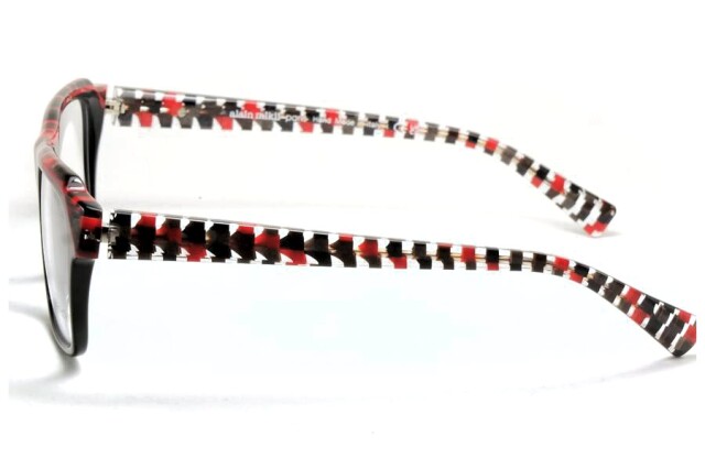 黒を基調とした柄がちりばめられ、フロント上部にレッドのラインと様々なカラーがテンプルまで施されアランミクリらしさを主張しています。