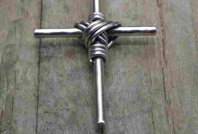 十字をひもで縛ったようなデザインが特徴のペンダントトップ。