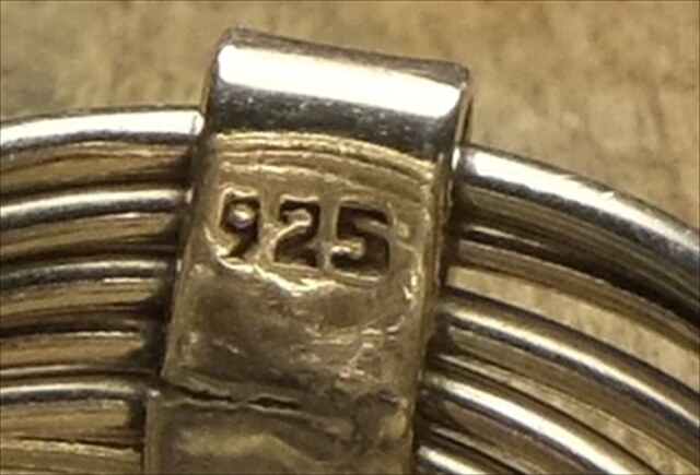 銀は柔らか素材なので、100%銀にしてしまうとアクセサリーに向きません。そこで固い素材である銅などを混ぜることで高度を出しています。素材に92.5%銀を含んでいるという意味を持ちます。Sterling スターリングシルバーも同様の意味で使われます。